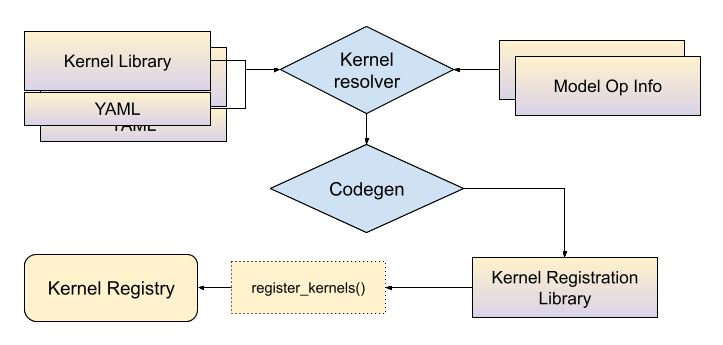 在构建时,与内核库关联的 YAML 文件将与模型算子信息(请参阅选择性构建文档)一起传递给 *内核解析器*,结果是算子名称和张量元数据组合与内核符号之间的映射。然后,代码生成工具将使用此映射生成 C++ 绑定,将内核连接到 ExecuTorch 运行时。ExecuTorch 用户需要将此生成的库链接到他们的应用程序中以使用这些内核。