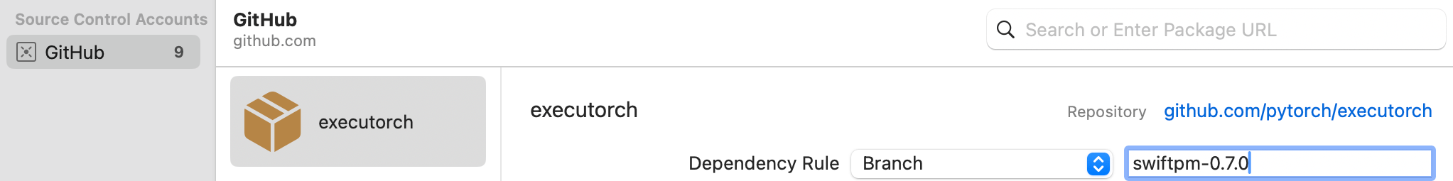 。将 ExecuTorch 仓库 的 URL 粘贴到搜索栏并选中它。请确保将分支名称更改为您想要的 ExecuTorch 版本,格式为“swiftpm-